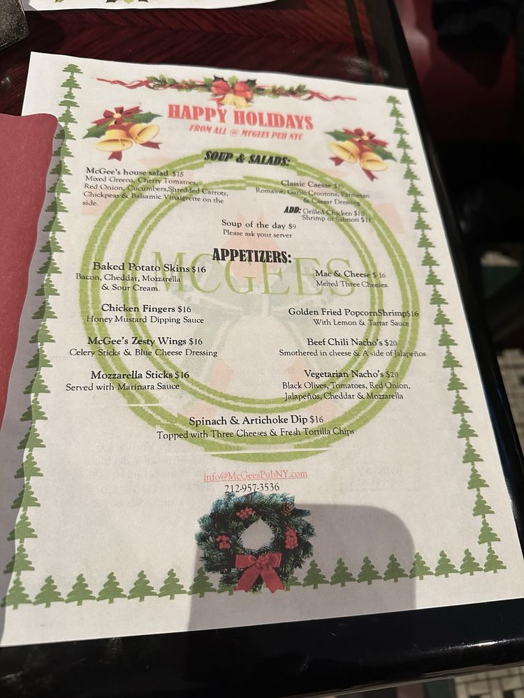 McGee's Pub, located at 240 W 55th St in New York City, offers a diverse menu of burgers and sandwiches. The establishment provides a casual dining experience with options for takeout, vegetarian dishes, and accepts various payment methods. With amenities like private dining, outdoor seating, and a full bar, McGee's Pub caters to a wide range of preferences. Customer reviews highlight the friendly staff, delicious food, and affordable pricing. Notable dishes include the Baked Potato Skins, Cajun Chicken Salad, and Onion Soup Au gratin. As a fan of "How I Met Your Mother," visiting this pub evokes nostalgia with decorations honoring the show. Overall, McGee's Pub stands out for its inviting atmosphere, tasty food, and attentive service, making it a must-visit spot in the city.